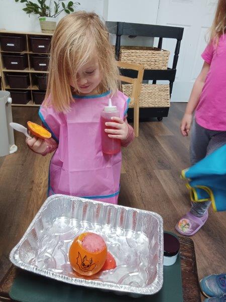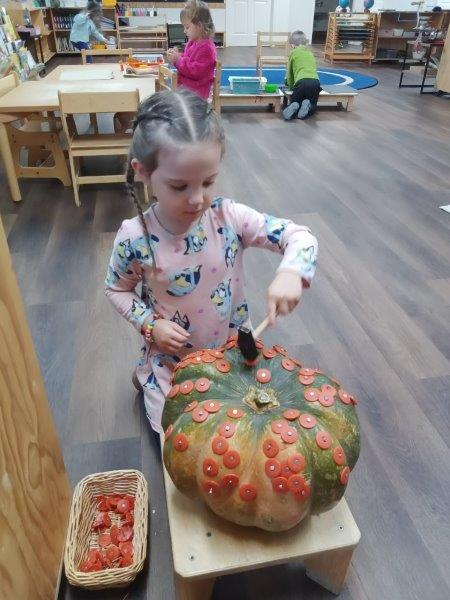Throughout the month of October, the children at Immanuel enjoyed a rich, hands-on exploration of apples and pumpkins. They created colorful apple prints, learned about the apple life cycle, washed apples, and practiced fine-motor skills by sewing apple-shaped cardstock. One of the highlights was peeling, coring, and cutting fresh apples, then adding warm, fragrant spices to make homemade applesauce. Their pumpkin study was just as engaging—painting big pumpkins, scooping out seeds, and mixing those seeds with butter and salt to roast before enjoying the tasty snack. They also used a variety of pumpkin stencils to create beautiful artwork, made delicious pumpkin French toast and pumpkin bundles, and discovered the life cycle of pumpkins. Excitement filled the room when the children added vinegar to baking soda inside carved pumpkins to create bubbly pumpkin volcanoes. They even learned about Giuseppe Arcimboldo, the Italian artist known for creating portraits from fruits, vegetables, and other objects, and were inspired to make their own portraits using real produce as well as cutouts. The practical life shelves were filled with charming apple and pumpkin bowls that supported their work. To end this memorable month, the children joyfully released the Monarch butterflies they had been raising in the classroom. It was truly a fun and enriching October! Happy Birthday Emmett:). Please click on the link below to enjoy the pictures:).